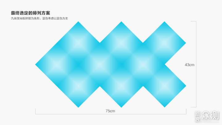 在灯板的排列方式上,我的想法是尽可能使灯板占用横向空间,在视觉上可以与桌面的宽度保持一致。减少高度空间的占用,使得整体偏向修长,且不会特别占用墙面上方空间。使用画图软件试了很多种方案,最终选择了类似鱼形的图案设计,实际测量整体宽度75厘米,高度43厘米。