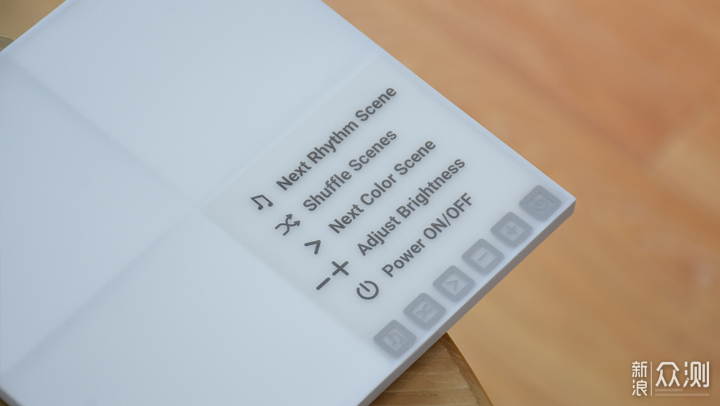 讲到这里,就要分享一下Nanoleaf智能方块灯的交互操作了,有了交互才会显得更加智能。在控制板右下角设计有六枚触控按键,依次分别为音乐跟随、循环模式、灯效切换、灯光亮度调节和电源开关。除此之外还可以通过任意一块灯板感应操作,比如连续拍两下关闭或打开等,科技感和未来感十足。