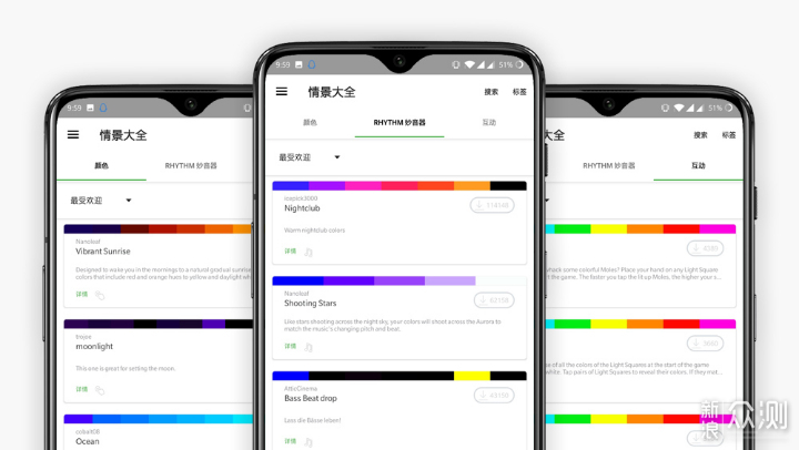 情景大全中提供了一些网友自定义好的灯光颜色和模式,包含颜色、秒音器和互动三种场景下的光效,有需要却又懒得折腾的同学可以直接去找一些符合自己喜好的灯效配置文件下载。