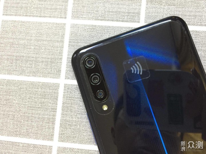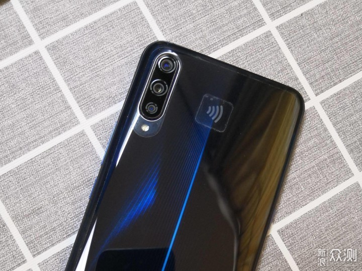 竖排的后置三摄,和华为P20 Pro比较类似,摄像头下方还设置了一颗闪光灯(非冷暖双色),三颗镜头分别为最上方的1300万像素120度超大广角的广角镜头+中间的双核1200万像素主摄+最下方的200万像素景深镜头。镜头的右侧中部是NFC位置,厂商还非常透贴心的放置了一枚贴纸提示。