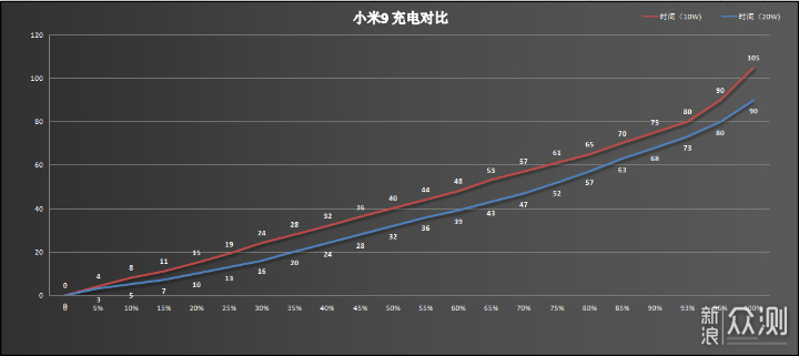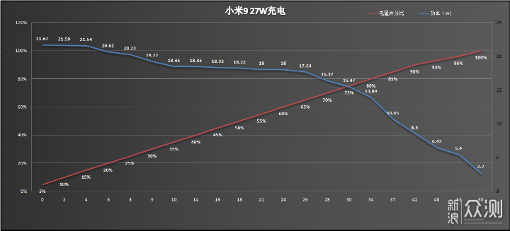 拥有27W快充的小米9,能够在30分钟内从5%充电到75%。60分钟能够充到100%,不过在100%电量后依然以2.7W的功率在补电。