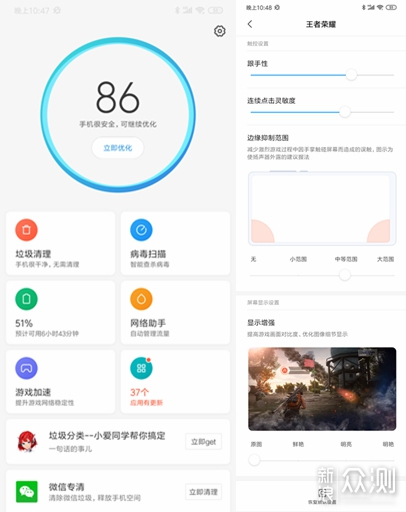 从安全中心可以进入游戏加速功能。游戏加速能够单独为游个性化设置,设置屏幕的灵敏度和边缘影响区域,也能为游戏定制显示方案。关闭亮度自动调节、来电自动免提等功能,让用户能够更好的体验游戏。