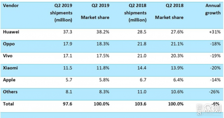 一直与华为竞争的小米科技在2019年第二季度销量前五名中,是销量下滑幅度最大的一家品牌,1150万部的销量相较于2018年第二季度有20%的下滑,排在这份榜单第五位的厂商是苹果,其在中国市场的销量已经下滑至570万部,下降幅度达到14%。