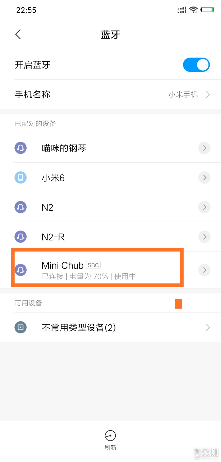 打开手机的蓝牙,选择Mini Chub进行配对连接,连接成功即可使用,在手机上可以时时看到音箱的电量,方便正常使用。