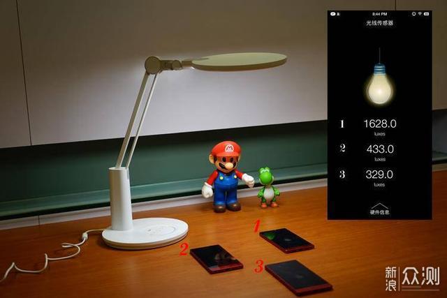 笔者根据日常使用习惯,将台灯调节至40厘米的高度,从1、2、3测量台灯最大亮度,读数见图。根据台灯使用标准,最大亮度1600流明有些刺眼,按说500流明就可以正常使用,下面测一下感光模式下亮度。