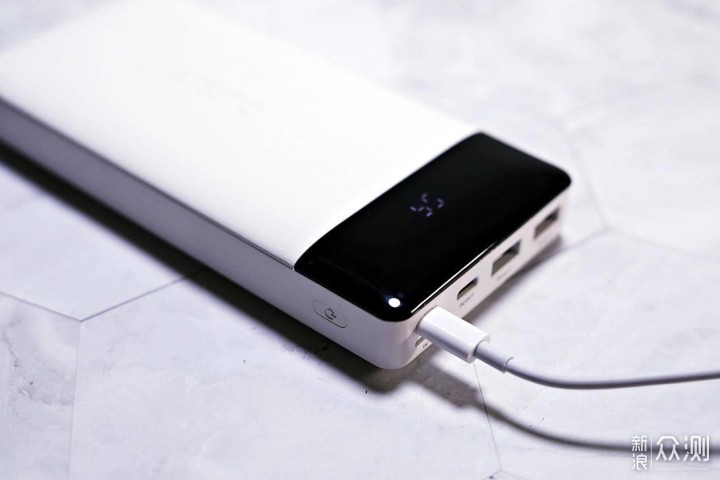 充电宝上部即是相关接口。之所以说睿能宝这款充电宝为“三进三出”,从上图我们也可以看到,其备有一个Lightning充电输入口、一个Micro-USB充电输入口、一个USB-C输入输出二合一接口,以及两个USB-A充电输出口。 其中,Lightning口还经过了苹果公司“MFi”认证,这下不怕iPhone再弹窗不支持了;两个USB-A输出口,均采用了iSmart自动匹配智能充电技术,其中iSmart 1口支持最高18W快充输出。 二、把玩RAVPower出厂自带部分电量,在55%左右。电量剩余数显精确到1%,更方便掌控对充电宝自身的充电频率。