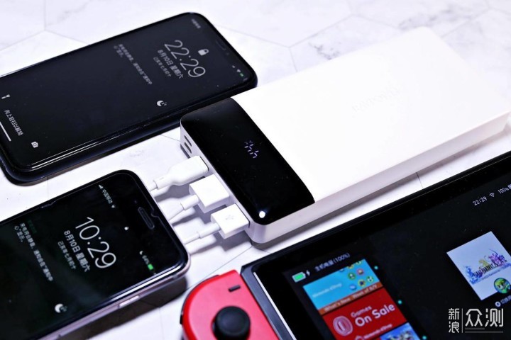 晚上9点13分,iPhone X剩余电量35%,开充。打了一局星际争霸2的合作模式,时间锁定在晚上9点43分,正好半个小时,iPhone X当前电量76%。 半个小时,在非“零”电量的情况下,给iPhone X充了40%以上的电,可以!看来快充是实锤了。 在开始充电式,睿能宝移动电源剩余电量54%,半个小时完成充电测试剩余电量47%,也就是消耗了7%的电量,也就是1400毫安。iPhone X电池容量为2700毫安,充电41%为1107毫安。也就是睿能宝阿波罗号移动电源的充电输出效率为1107除以1400,达到了79.07,%,非常不错的成绩了。 当然,差旅中携带20000毫安的充电宝更重要的是能够满足多设备充电,一个一个充效率太慢,三口同时输出才是效率最大化。 由下图可见,睿能宝充电宝通过一个USB-C和两个USB-A接口同时对iPhone X、iPhone 6以及Switch充电完全没有问题。2万毫安的容量撑满这些设备的全天使用也绰绰有余。