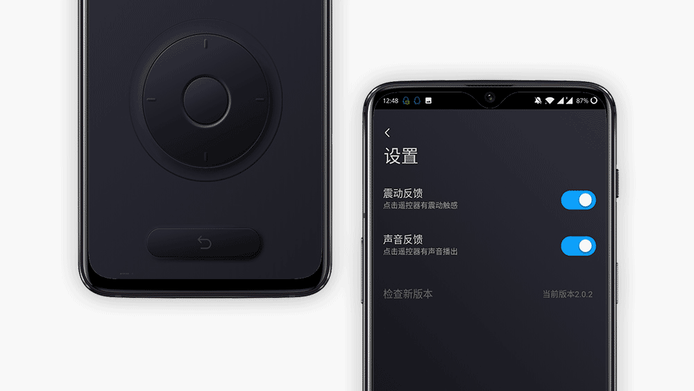 坚果控App有按键模式、触控模式和遥杆模式三种虚拟操作面板,按键模式为点按交互,触控模式为触摸滑动交互,遥杆模式点按与触控滑动均可。为了模拟真实遥控提的反馈,还设计有震动反馈和声音反馈。