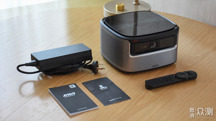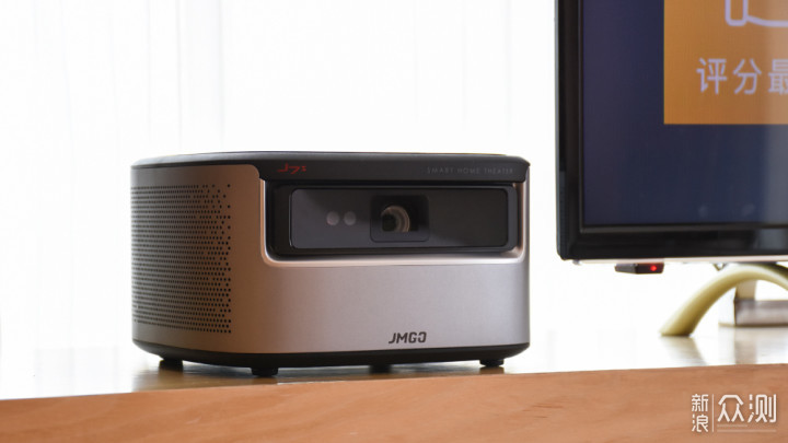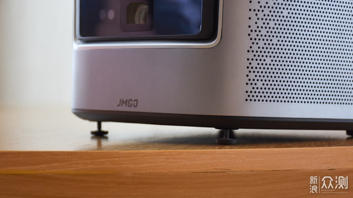 机身前方主要是镜头区域,在一块透明挡板下方中间的位置就是坚果J7S的投影镜头,偏左的位置还有两颗传感器,目测应该是红外线传感器和激光测距传感器。镜头和传感器处没有设计保护盖,日常使用中需要注意避免刮花。左上角标记有J7S型号标识,下方正中间印有JMGO英文标识。