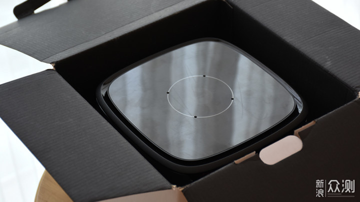 机身顶部是一块悬浮式设计的亚克力面板,纯黑色并辅以同心圆的纹路处理,亮面质感确实比较容易刮花。最中心的区域是一枚触摸式电源按键,周围圆环上的四个开孔是麦克风阵列。触摸式按键主要是在放置状态下操作,如果是悬挂状态下就够不到了,因此也没有在机身上设计更多功能的按键。