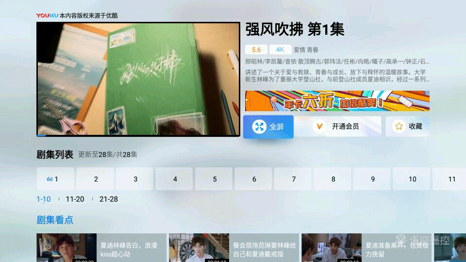 影视资源点播页面以缩略图形式播放当前影视资源,右侧对该影片的信息有详细介绍,点击“全屏”可全局显示。在播放界面提供清晰度选择,部分片源最高为4K画质,一般片源最高提供1080p画质,根据网络情况和画质需求自定义调节,一般家庭20M左右带宽播放1080p画质没有太大问题。