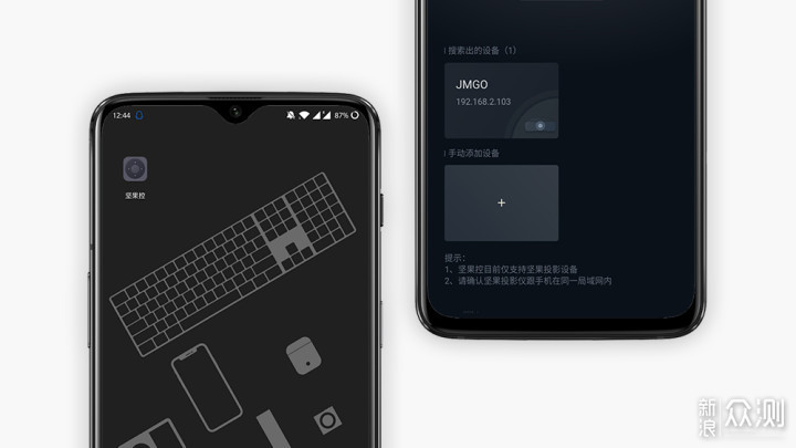 除了使用遥控器交互以外,坚果J7S还提供了手机App远程控制功能,这也比较符合互联网思维下的产品设计思路。手机下载安装坚果控App,在AppStore和各大Android应用商店都可以找到,也可以打开坚果控TV端扫描二维码下载安装。安装好后将手机和坚果J7S接入同一个WiFi网络环境,打开软件会自动搜索到坚果投影仪设备,点击进入操控面板。
