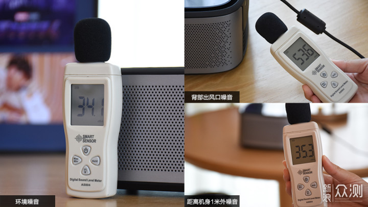 风扇在散热时也会发出一定的噪音,在比较安静的室内噪音感知还是比较明显的,不过距离投影仪一定距离以后就会弱一些。所处测试环境的底噪为34.1分贝,机身背部出风口的噪音为53.6分贝,距离机身一米左右测试的噪音为35.3分贝。总体来讲,在开启声音播放的时候,噪音感知会弱化很多。
