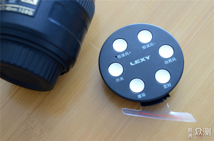 莱克魔力风智能空气调节扇提供有遥控器,遥控器个头比较小巧,圆形面板,面板上设计有机身上所有的开关。