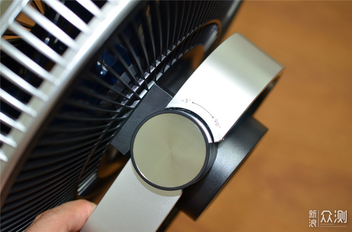 风扇支持水平向上90度,水平向下5度的角度调整,可以看到角度标识提示。