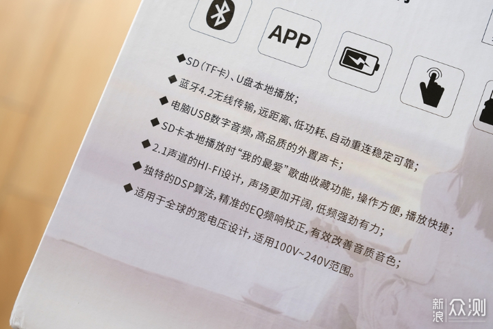 包装盒的背面主要是关于产品的功能介绍,除了蓝牙采用4.2版本而非5.0有些落伍外,其他性能都还不错。既可以充当电脑外置声卡,又是采用2.1声道的HiFi设计,还具备了独特的DSP算法等,这些综合起来可比市面上绝大多数的蓝牙音箱要强悍许多。