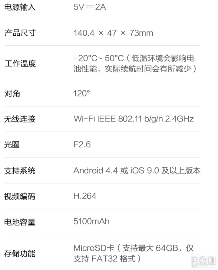 ▲小白摄像机的由于内置了高容量电池,所以个头和体积比一般的摄像头稍大,自身重量也比较重。摄像头自重270G,最大支持64G MicroSD卡,视频编码为H264,对角120度。网关电源输入5V 2A。 开箱