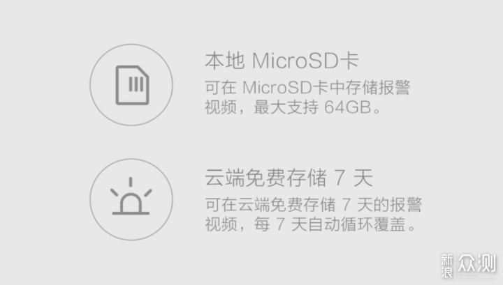▲小白的报警视频的存储方式有两种,一种是在本地MicroSD卡存储报警视频,存满之后需要直接使用新的报警视频自动替换覆盖,不过由于SD卡内仅仅保存报警视频,所以64G可以存储很多天的视频数据,也可以在云端免费7天自动循环覆盖,也意味着你购买机器之后不使用MicroSD卡也可以使用。