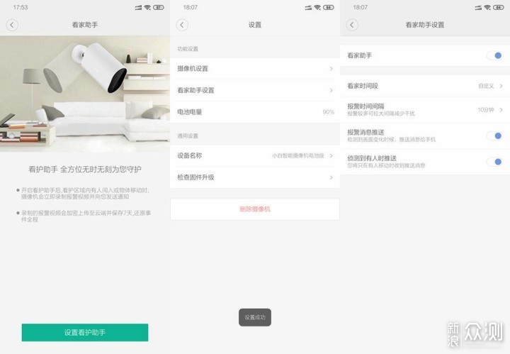 1:小白智能摄像机的优点,不需要布线适合安装在家庭各位位置,120度广角,支持PIR红外和AI 人形探测, 2:支持本地MicroSD存放报警视频和7天云储存视频,有卡没有卡都可以使用。 3低功耗的设计日常可以使用100天,电量报警之后可以取下来给机器充电之后再安装。底座为可拆卸设计。 4:夜视功能清晰,夜间也可以很好的监控房间。 5:主机支持IP65防水防尘,可以在室外各种区域使用,搭配网关和2.4G WiFi实现远程监控报警。 6:远程监控者使用米家APP可以实时观察家庭被检测区域,同时也可以开启语音通过摄像头内部的扬声器和监控对象对话,有的时候在外面出差打开和女儿聊聊天也是不错,但是还是会影响续航。