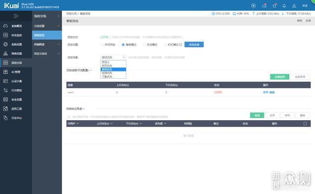 3.特色功能之智能流控 给多人使用的路由器就要考虑到智能流控功能的必要性了,就是通过设定各种协议控制次要应用的流量,从而达到重要应用的流量稳定性。这款路由器支持的智能流控分为:关闭流控、智能模式(默认下)以及自定义模式。这里推荐智能模式,只要选择自定义、游戏、网页、下载、网页优先,就自动优化网速了。还有特别打造的钉钉模式,一旦发生拥塞,会优先保障高速通道的人上网,其次才是默认网页和钉钉,最后才是P2P下载和视频。