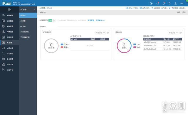 4.特色功能之AC智能管理 爱快路由系统中集成了AC智能控制功能,企业可以通过AC智能控制模块对路由系统所连接的AP(Access Point,无线访问节点)进行统一管理,包括为AP提供启动的默认配置、对AP进行批量配置修改、查看AP信息和重启、升级等维护操作。很方便企业这种大型内部网络集中管理,无线WiFi配置一次搞定。