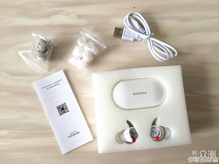 产品的全家福就是这样子的,通关文牒式的说明书、随机赠送的多副耳塞、耳挂,电池仓也由原来的长柱型改成这种主流的椭圆型了,数据线、2个小巧玲珑的真无线蓝牙耳机就是全部了。耳机与充电仓镶嵌在白色的泡棉保护层上,厂家的用心设计让白色融为一体,美感十足。