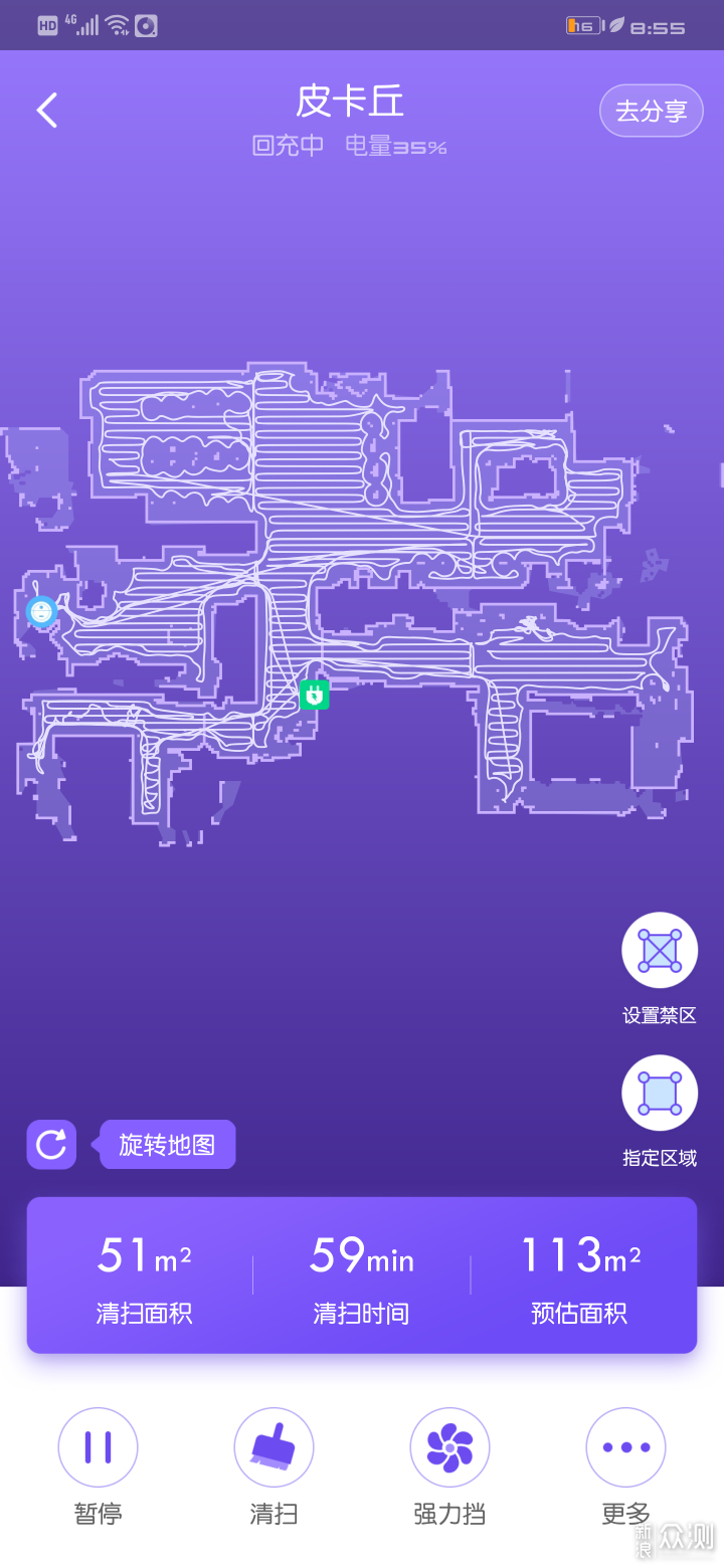扫地机内地图不会存储在机器人,所以每次启动都会重新探测重新绘制。第一次清扫,房间对于扫地机来说完全陌生所以需要比较多的时间。强力档清洁到后面发现电量不足,调整为安静档希望能够一次性完成清扫。两档吸力差别导致耗电量差别还是挺大的。