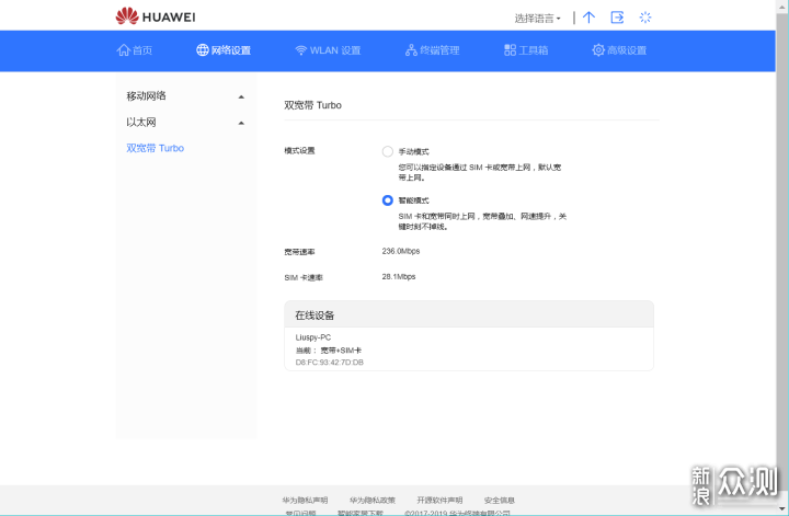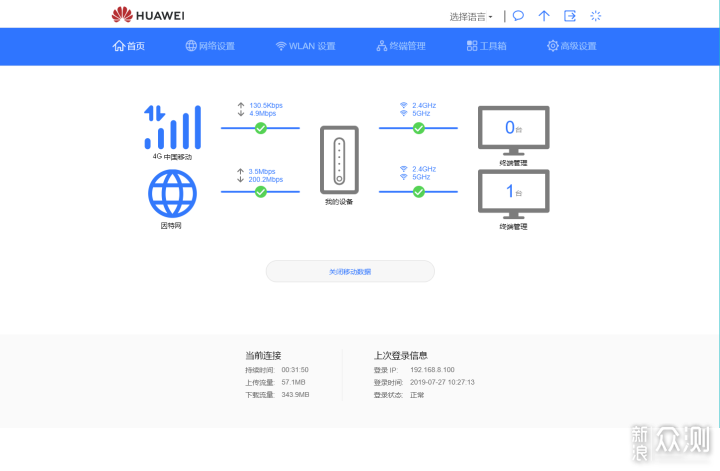 ▼可以看到4G网络与有线宽带进行了叠加,对原有的200M宽带进行了提速。