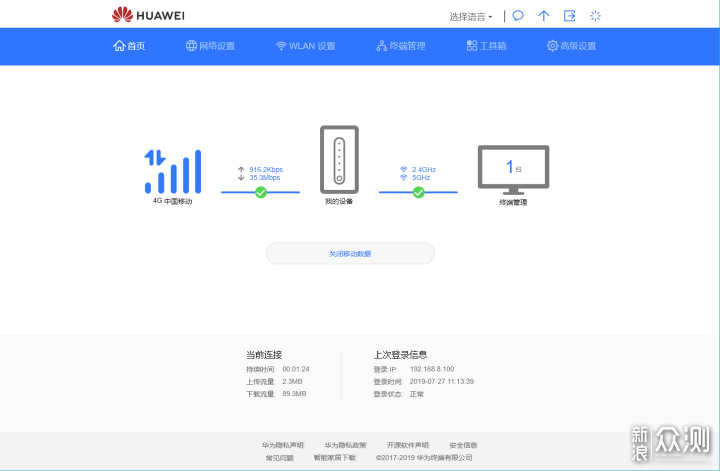 五、总结总的来说,华为4G路由2 Pro是一款多用途路由器,实现了多场景下WiFi网络快速覆盖,解决了“特殊”群体的迫切需求。其具备的4G百兆全网通、宽带叠加、插卡即用等亮点十足,对于用网难、办宽带难、商旅等用户群体来说是一个非常不错的选择。 1、亮点: (1)即插即用,快捷组网; (2)双网双通,负载均衡; (3)应用场景丰富; (4)WiFi信号稳定,覆盖范围不错。 2、还需改进: (1)需要使用Micro SIM(中卡),对于目前主流的nona SIM(小卡)来说需要配合卡托来使用; (2)不支持5G网络,如支持即将应用的5G网络就锦上添花了; (3)不支持充电宝供电,如能支持充电宝供电就更完美了。