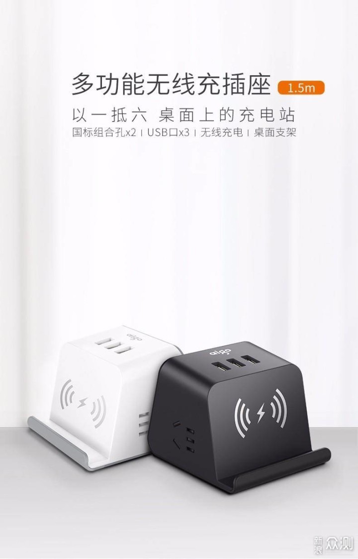 而侧面这是罗列了这个产品的功能优势,新国标插孔,无线充电,创意支架造型,3USB快充。
