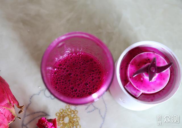 话不多说,榨个火龙果试试,选用正常大小的红心火龙果,拨开皮后刚刚好放进一个,压好,按下开关便开始榨汁,整个过程大约持续了40秒左右,与官方宣传的时间相差无几,经过4刀头的快速旋转,打出来的汁已经非常绵了,籽都被打碎了不少,下次得找个稍微坚硬一些的水果来榨一下。这里表扬一下米家便携榨汁机的自清洗功能,榨完之后只要装入清水,按两下开关便开始自清洗,过程与榨汁时间差不多,洗完直接把水倒掉就行,没有什么残留。