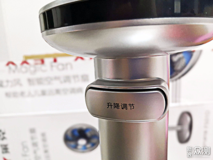 中控盘下方设计有升降调节按钮。按压后提拉风扇提手就可以调整风扇的高低,共有三档高度,可以从1米—1.1米—1.2米间进行选择。