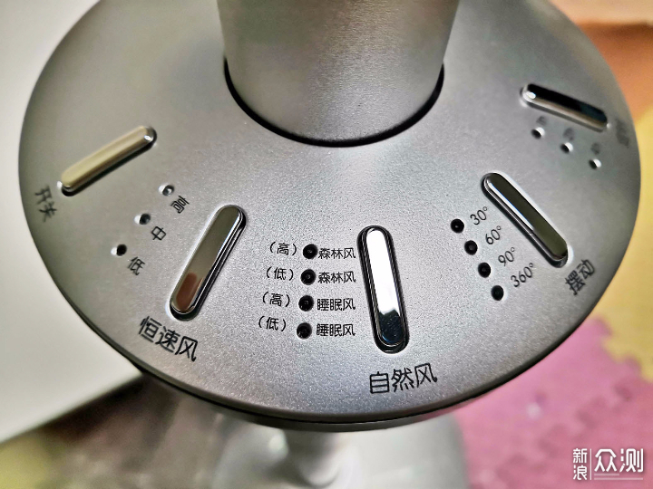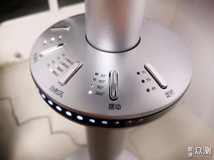 魔力风设计有飞碟状的中控盘,更为产品增添了几分科技感。中控盘上的按键布局合理,从左到右一次排开为开关键、恒速风切换键(高中低)、自然风切换键(森林风高、森林风低、睡眠风高、睡眠风低)、摆动切换键(30°、60°、90°、360°)以及定时按键(1h、2h、4h),不但将风扇的功能属性区分开来,而且很容易理解。