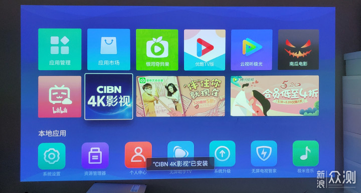 所以在一整个月的体验中,晚上我们都是采用开一盏灯的方式,既不影响观影感受,又能保证室内有足够的光线便于走动。 三、应用极米H2的系统可以装大部分你说知道的视频网站电视端App,优酷、爱奇艺、搜狐、芒果、哔哩哔哩、腾讯,几个常用的都覆盖到了。