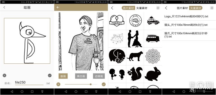 在App主页你不仅可以选择App中官方提供的现成的众多图案和素材进行打印,也可以选择自己的喜欢的照片图片或者是矢量图进行处理后打印,还可以自己在App上现场创作一幅画进行雕刻,因为指肚面积偏大,绘画时精准定位不容易,绘画功底几乎为0的我用手指照猫画虎创作的啄木鸟LOGO(下图左一)十分小儿科吧!不过就在体验期间,官方升级了App,增加了绘画中的输入文字、印章雕刻等功能,功能更多更实用了。