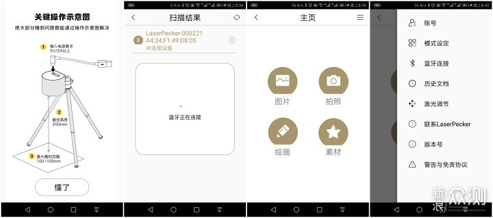 整个安装过程还是比较简单的,之后就可以开始打印了?当然不行,还必须要安装“激光啄木鸟”手机App进行联机控制,App是通过蓝牙与激光头实现连接,进行图案选择和相关打印参数设置。