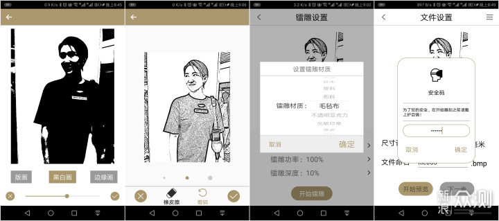 我比较喜欢的是照片雕刻功能,App提供了照片编辑处理功能,有版画、黑白画和边缘画模式可选,同时,你还可以对画面进行剪切和局部擦除处理,虽说用手指操作有点吃不准,但是还是挺有用的,去掉一些没用的背景还是比较实用的,看来需要买个定位更精准的感应触控笔了,绘画和修改起来精准方便。官方提供了十多种常用材料的雕刻参数,直接选择就好,正式启动雕刻指令前需要密码验证,提高了使用安全性。