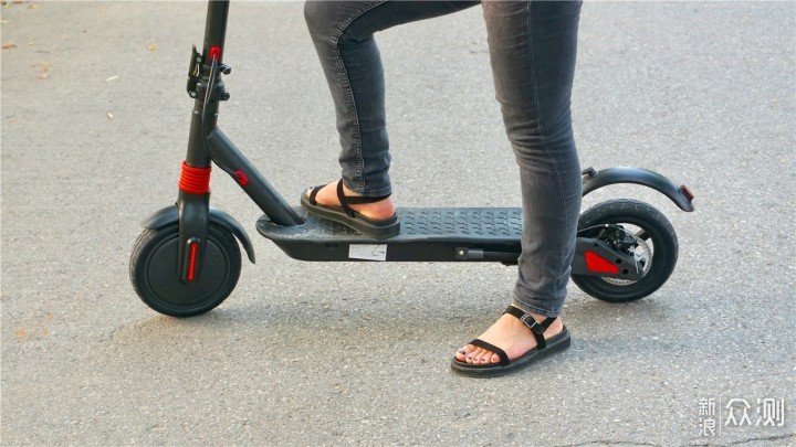 踏板部分长度为145mm,长度足够站立和安装座椅后双脚并排放置在上面。另外前后两个轮胎都采用了8.5英寸蜂窝胎,它的好处在于不用充气,不用维护,不怕爆胎。但同时也会带来一定的问题,削弱了轮胎的缓冲能力,减震效果也会相应地减弱。