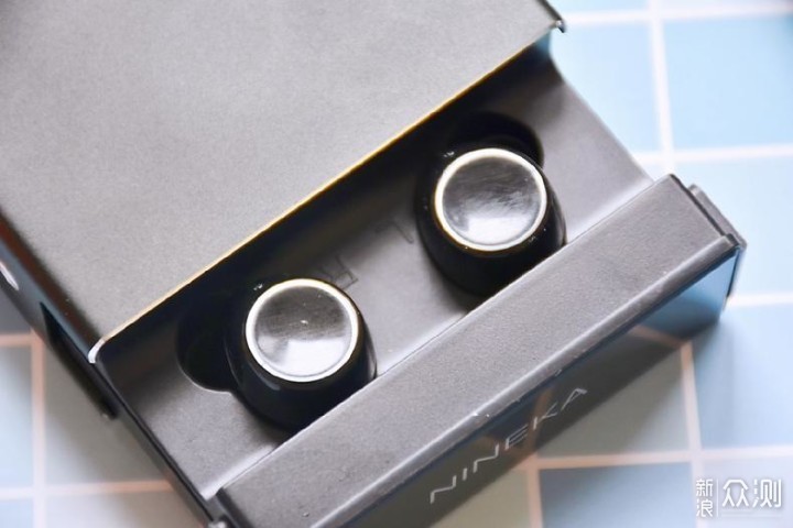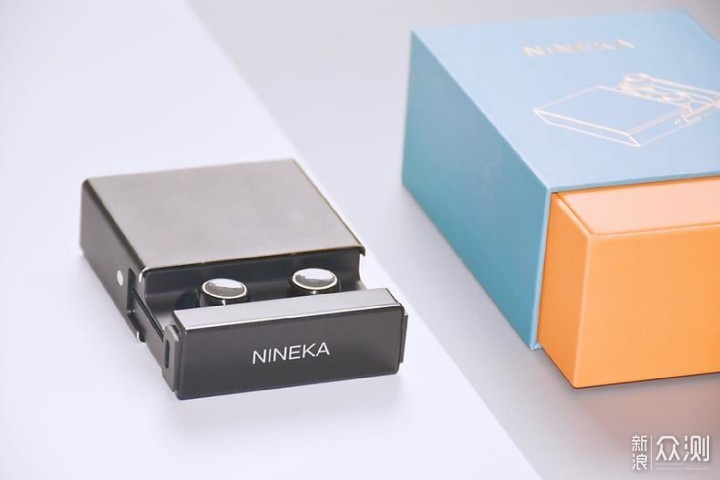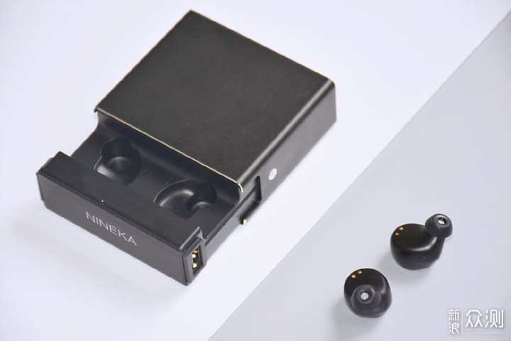 充电盒采用全黑配色设计,顶部和底部以银边点缀,顶部印有银色的“NINEKA”LOGO装饰,整体外观时尚、科技感不错。但是棱角分明的设计略显不圆润,拿在手上边缘有些不适,如果是圆弧状设计使用的舒适度更好一些。