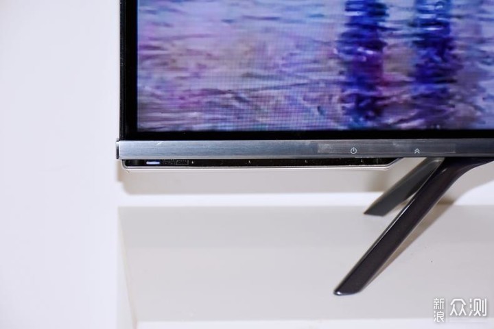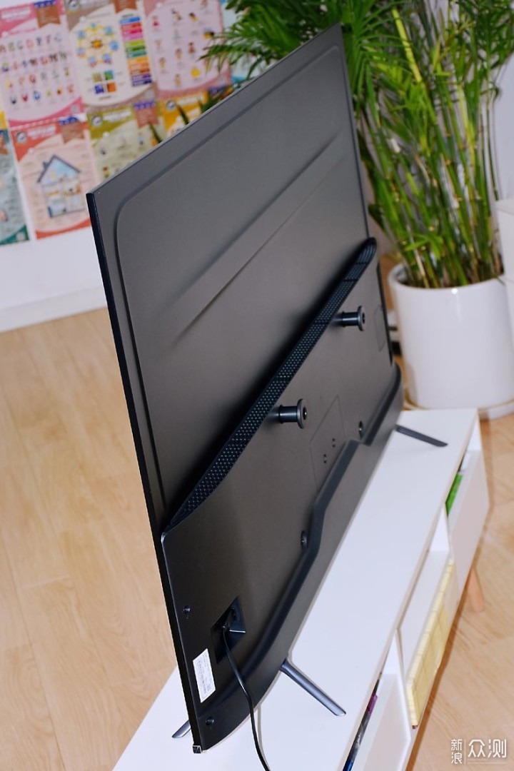 55英寸的窄边全面屏设计带来了视野宽阔的视角,观影追剧比较爽,比较适合一家人在一起观看。 电视主机厚度最薄处为8.7mm,约占整机的60%以上区域。全面屏机身与屏幕接缝处结合比较精细,屏幕距离边框不到一厘米的距离。因为家里墙上悬挂了投影仪幕布,电视没有选择挂起来,所以暂时以坐放的形式放在电视柜上面。但由于电视较薄,屏幕有较大,坐放的方式不是特别安全,还是建议悬挂起来。