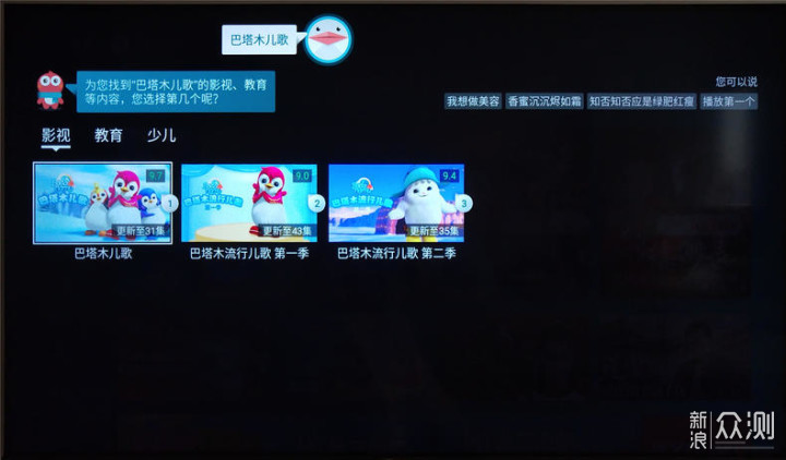 手机App做得较好,根据孩子的年龄推荐相应的学习视频,还可以在手机上看学习记录以及练习情况等。教材同步课适合在外面给孩子补课嫌贵又觉得时间不充裕的家长哈哈。 四、AI体验:智能交互较灵敏1、24小时AI智能音箱 可以在海信E7D的设置中开启“智能音箱模式”,然后在关机的时候出现两个选项,分别是“直接关机”和“进入音箱模式”。优先选择的是音箱模式,如果6秒无操作即自动进入智能音箱待机模式。担心孩子看电视伤眼睛的话,可以利用音箱模式,呼唤“海信小聚”,这个不错哦。 家里已有至少五个品牌的智能音箱,海信E7D的AI交互处于较前列。识别的准确度还不错,英文歌也可以较准确识别出来。如果是电视节目的话,可以直接打开电视画面,比如孩子喜欢看《巴塔木儿歌》的视频,在待机状态下, 我说:“海信小聚,给我播放《巴塔木儿歌》”, 这时候电视屏幕亮。关机进入音箱模式后,AI人机互动的具体过程,用一个简单的流程对话如下: 我:“海信小聚。” 海信:“在的。” 我:“我想听《巴塔木儿歌》。” 海信:“我还在学习呢,很快就可以回复您了。” 我:“海信小聚。”海信:“在的。” 我:“《巴塔木儿歌》” 海信:(电视屏幕亮起,出现三个《巴塔木儿歌》视频节目)“为您找到如下视频,请问您想观看第几个?” 我:“给我播放第一个吧!” 海信:打开第一个《巴塔木儿歌》节目进行播放。