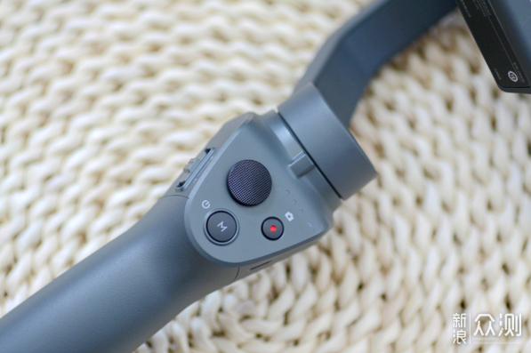 从整体外观上来看灵眸OSMO2代手机云台,还是保持着与1代同样的手柄微微凸起的弧度设计,手柄的整体为粗磨砂有颗粒感的纹理修饰,在握感上较为舒适能起到一定的防滑作用,在键位和接口的布局方面也是一目了然,手柄的正面是方向控制按钮、电源模式按钮和拍摄按钮。