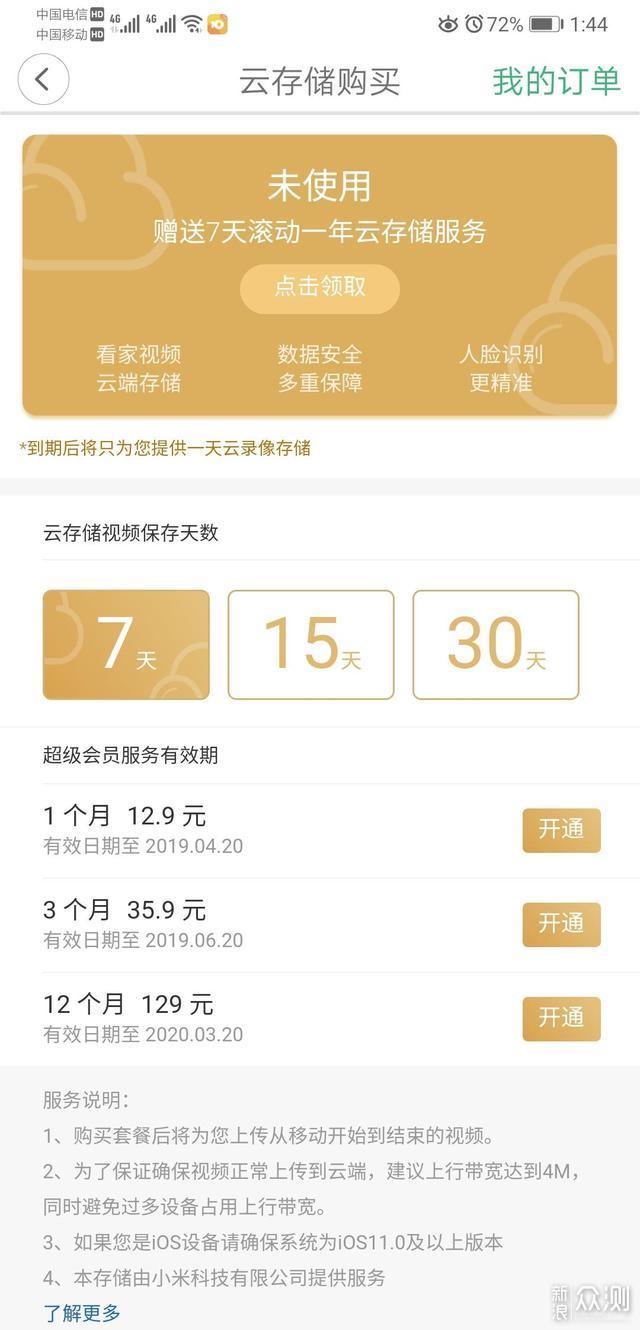 【视频存储】对于大家关心的视频保存问题,官方免费赠送1天云存储,而且赠送了1年免费7天云存储。如果想保存更久的视频,进行购买了,价格就有些贵了。
