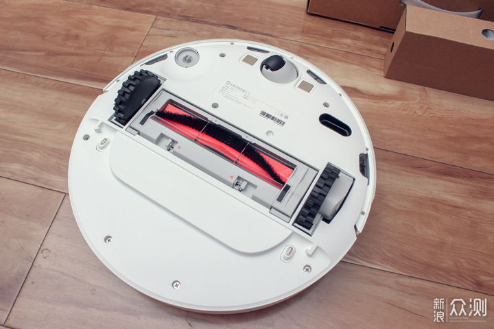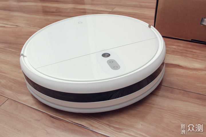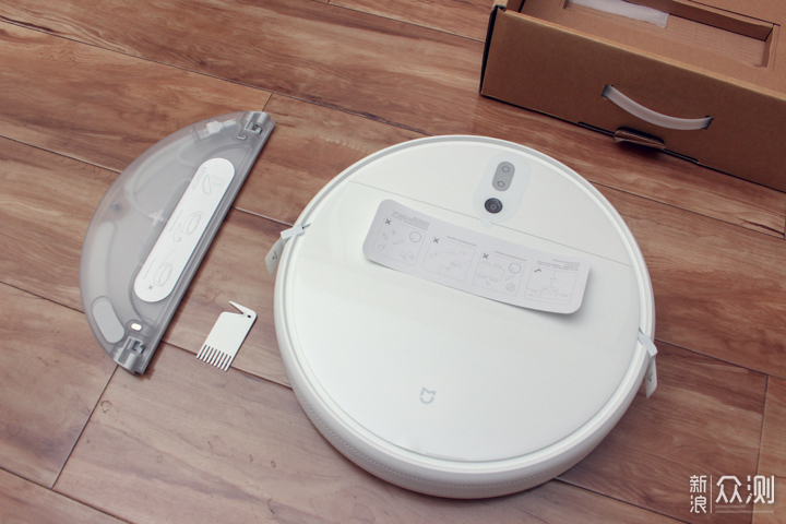 水箱下方包装着的就是扫地机器人了,纯白色的设计很漂亮,因为是视觉导航,少了激光导航的那种明显的凸起,机身上方只有两个按钮和一个摄像头。