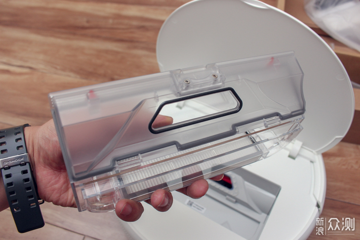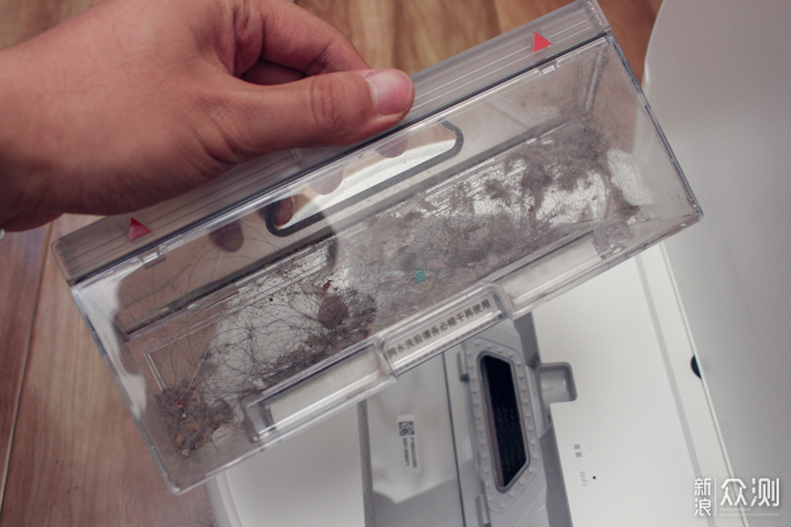 透明的尘盒取出过程很简单,尘盒内有滤芯,滤芯支持水洗,但是使用的时候要保证它是干的,尘盒的入口是敞口的,如果是尘盒内杂物过多的时候会存在取出过程尘土掉出的情况,解决方法就是勤于清理尘盒,不要等它满了在清理,不然在取尘盒的过程有可能是灰尘漏出。