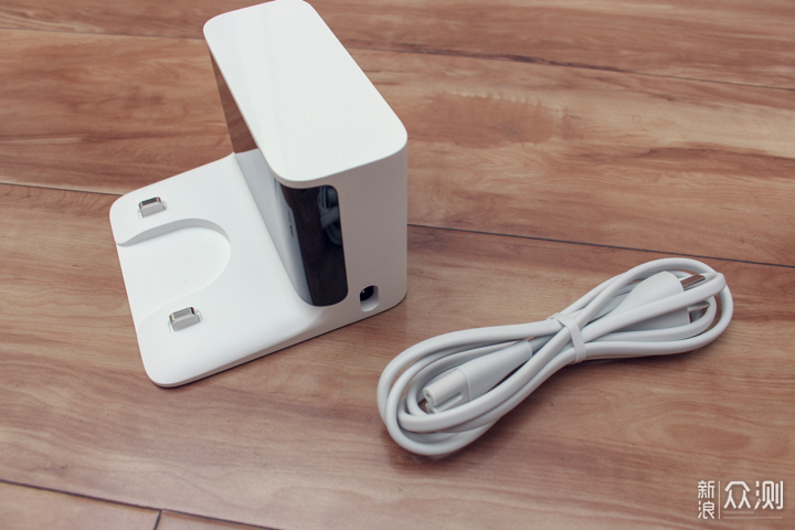 扫地机器人另外一个重要的部分就是充电桩了,充电桩比较小巧,长度大约是一拳头多的样子,底部会有两个金属触点,通过它与扫地机器人连接,实现充电,充电线可分离设计,整体充电座结构简介与扫地机器人设计风格一致。
