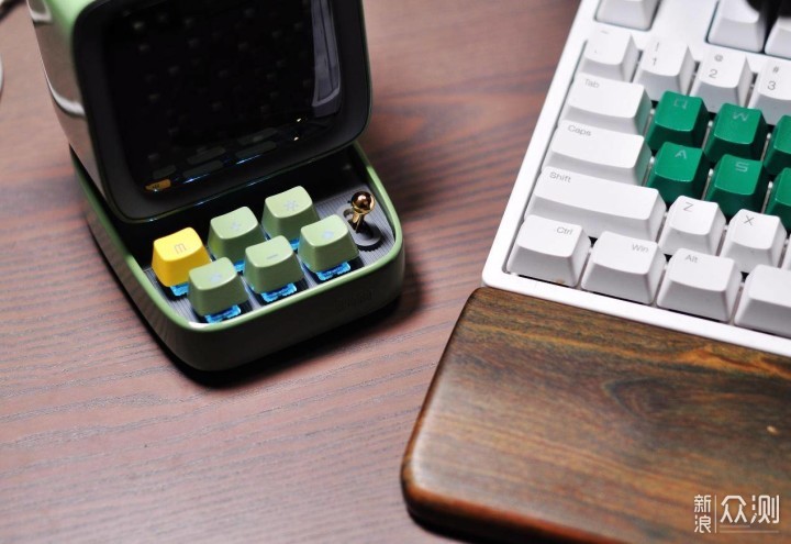▲打开箱子,第一眼抢眼球的就是那个排列整齐的6个机械按键,居然使用的机械按键的青轴,也就是机械轴里面噪音和滴答声最清脆的青轴。可以,这个操作绝对是666。