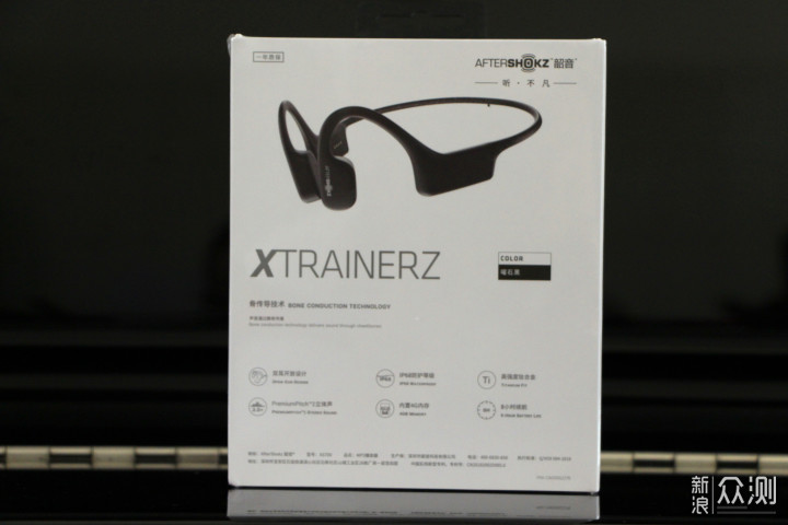 作为双耳开放式设计类型的韶音AS700骨传导耳机,包装的侧背面用细节展示了耳机的部分性能,如IP68防护等级、钛合金材质、4G机身内存、8小时持续续航等,当然,厂商和生产信息也是一贯的在机身背后!