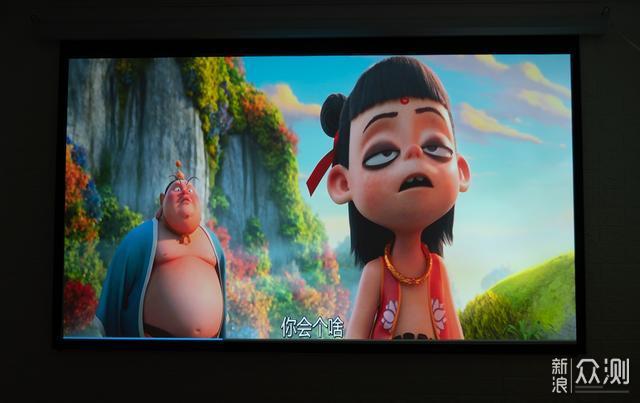 真正要想发挥出投影在色彩细腻程度及画面清晰程度方面的性能话,最好还是拉上窗帘或都晚上使用,这样最出效果,大家看下近期热播的《哪吒》屏拍照片,1080P分辨率真的很细腻,而HDR 10则会让暗部细节表现更突出。