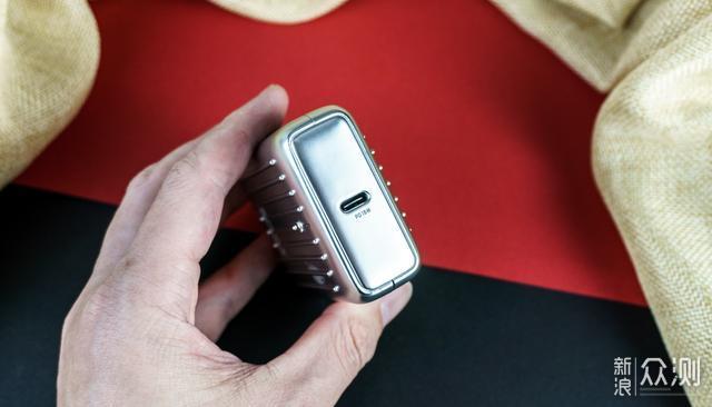 移动电源的个头比我预料中的要小许多,是我所接触过10000mAh里最小巧的一款,尺寸比一张信用卡还要小。虽说尺寸不大,但拿在手中却相当有份量。因为边角做了较大圆弧过渡,单手持握感相当不错。条纹装饰割手吗?感觉一般吧,手掌能感觉到竖纹的存在。